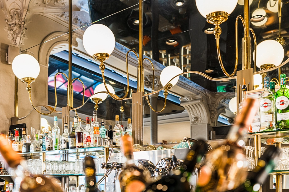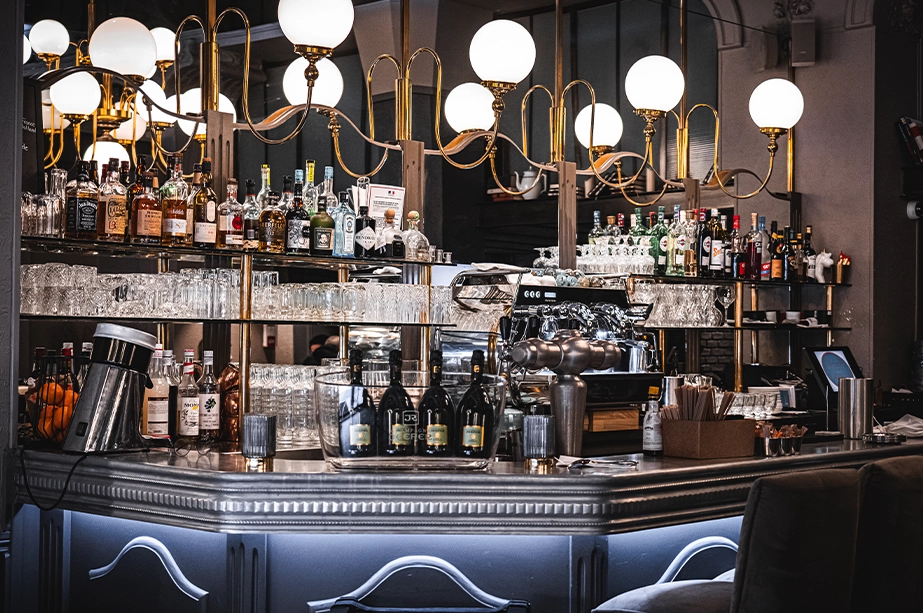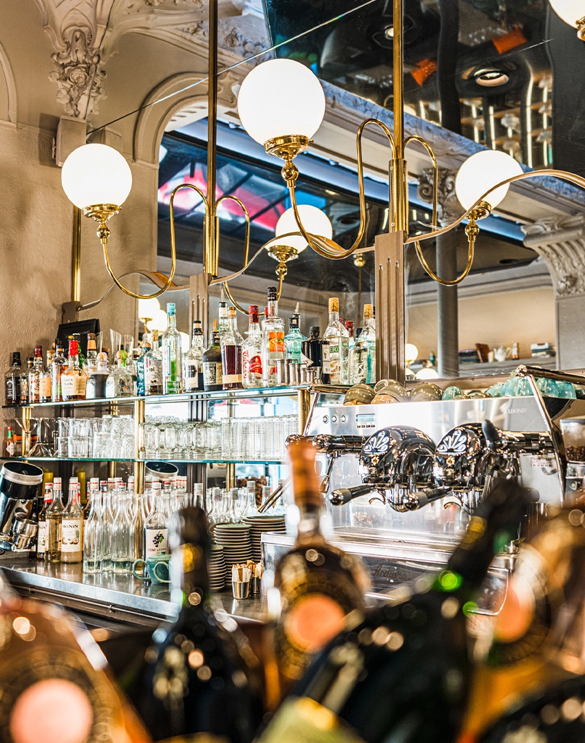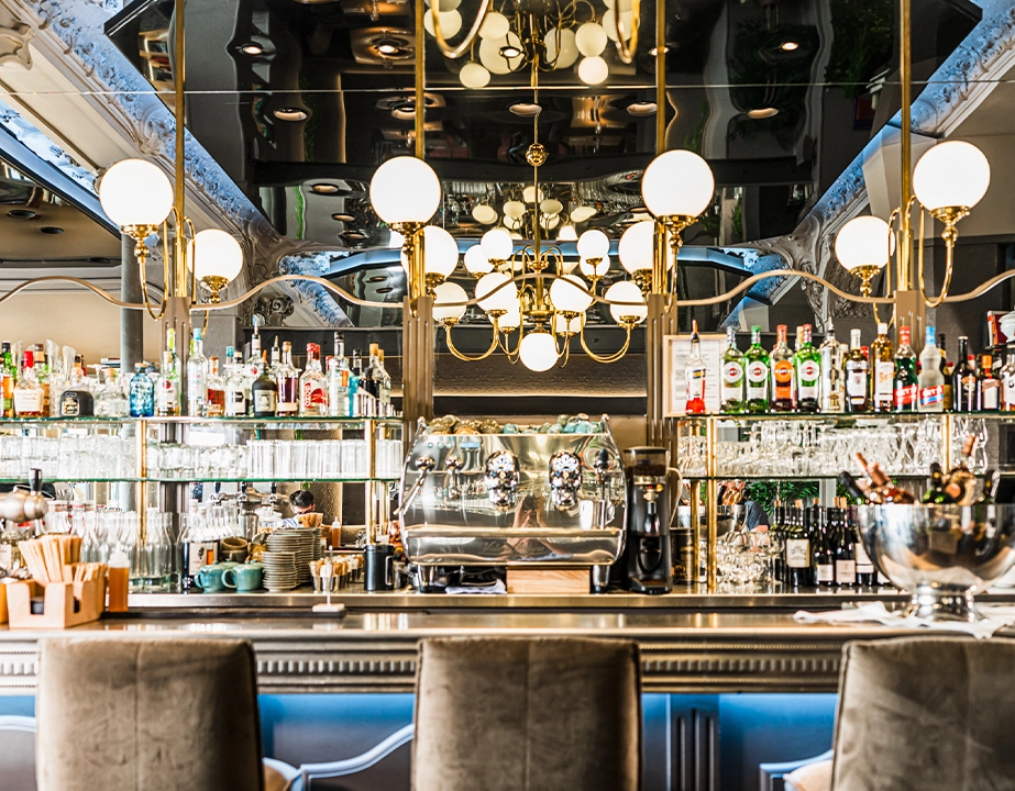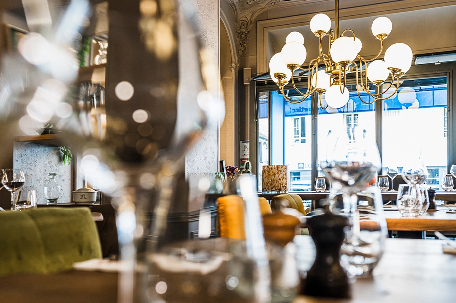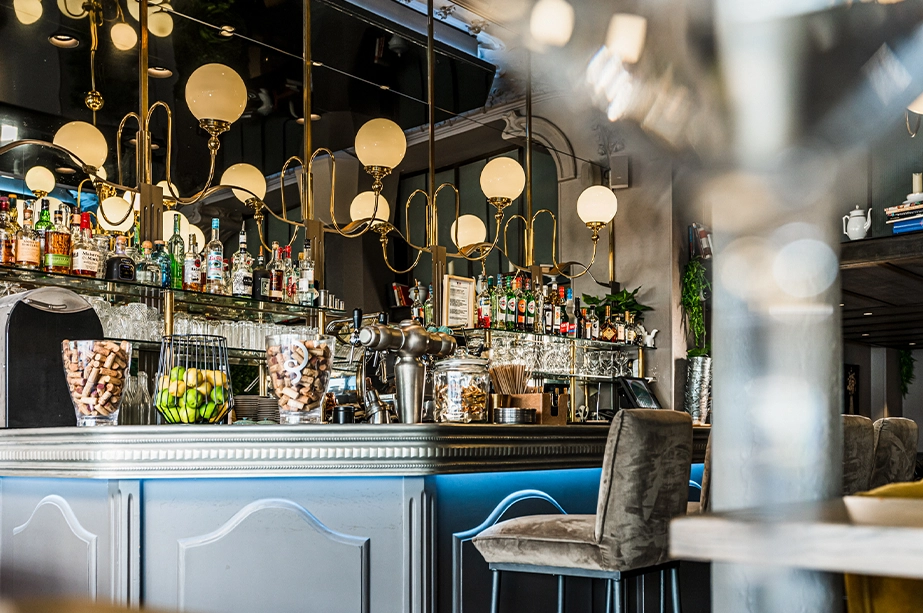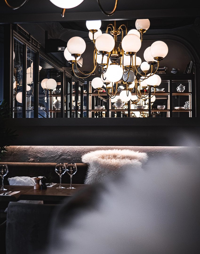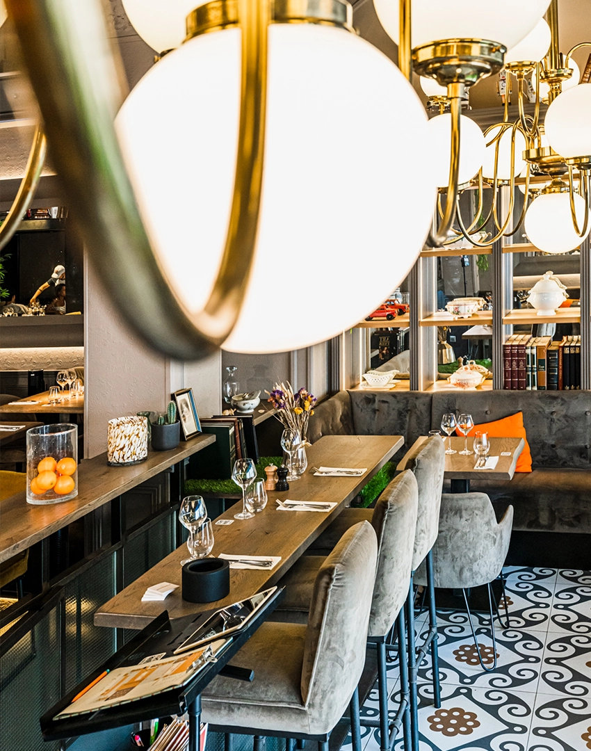 Les lustres, chic et volumineux, se marient parfaitement au bar en zinc moderne et aux tables en bois brut.