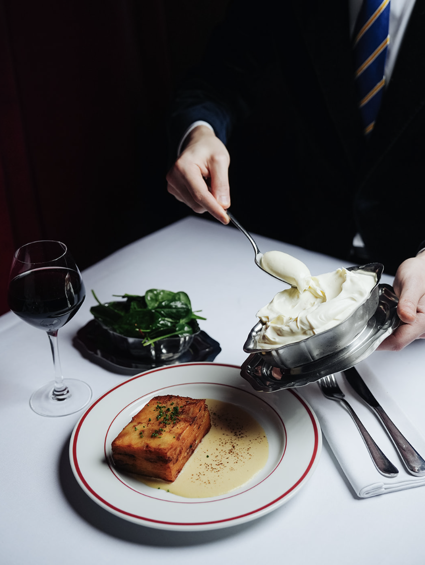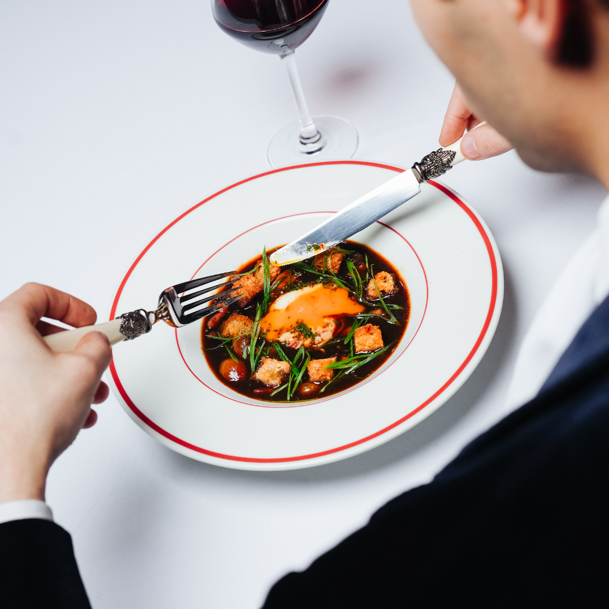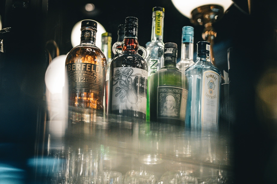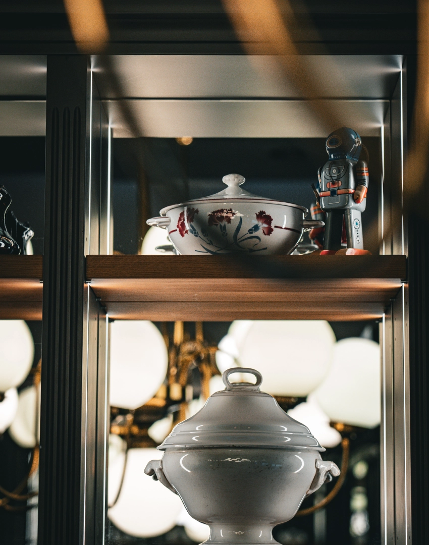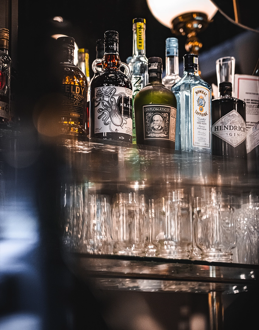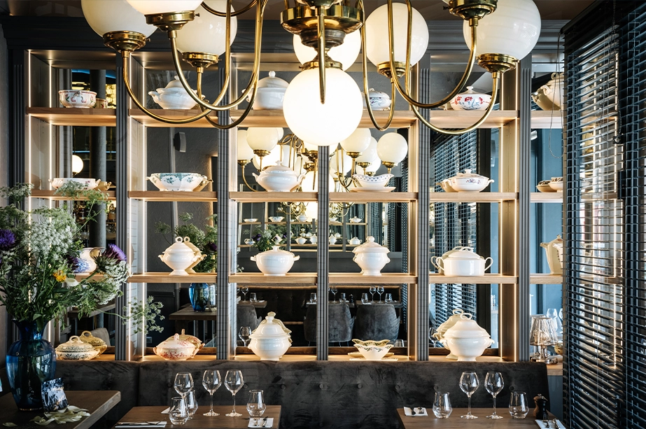 Les lustres, chic et volumineux, se marient parfaitement au bar en zinc moderne et aux tables en bois brut.